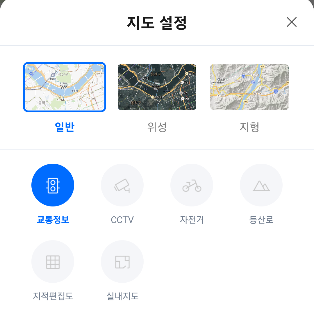 지도 설정 버튼을 누르면 지도 유형뿐만 아니라, 추가적인 정보 레이어를 켜고 끌 수 있는 기능이 함께 나옵니다. 이 기능을 활용하면 사용 목적에 맞는 지도를 더욱 실용적으로 구성할 수 있습니다.
