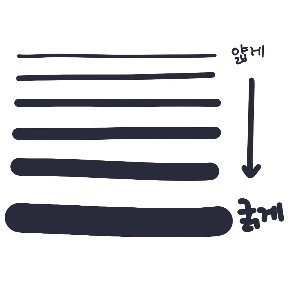 → 얇은 선에서 굵은 선까지 자연스럽게 그리는 연습