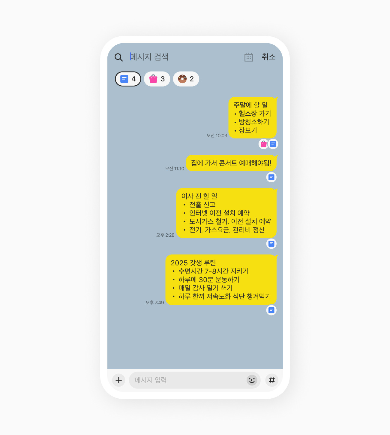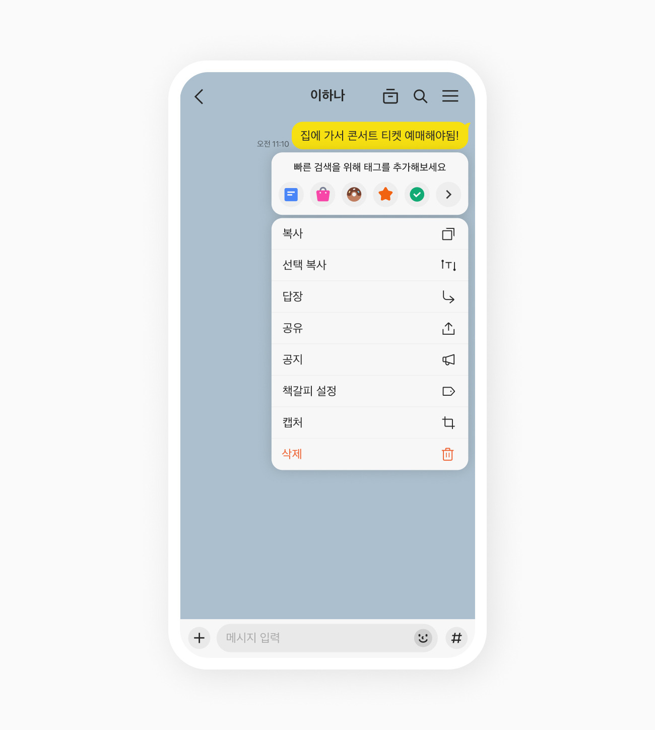 메모, 사진, 링크, 파일 등 어떤 내용이든, 메시지(말풍선)에 태그를 붙여두면