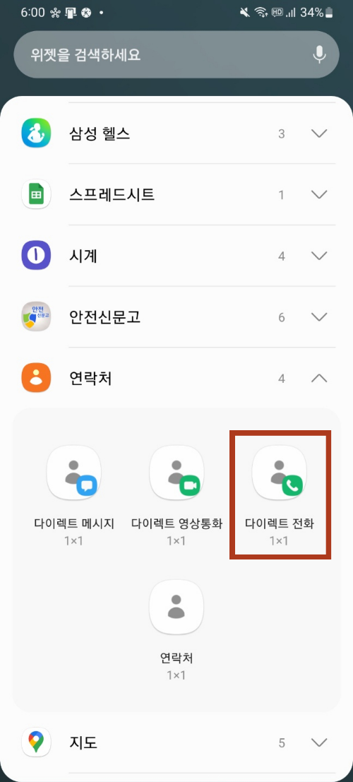 자 그런데 나는 자주 연락하는 가족, 지인이 많아서 단축번호가 너무 많이 지정해야 하거나, 혹은 단축번호가 자꾸 헷갈린다. 하시는 분들에게 추가 꿀팁을 알려드리겠습니다! 바로바로 스마트폰의 홈 화면에서 연락처 바로가기를 만드는 것인데요. 홈 화면에 바로가기를 만드는 것이기 때문에 위젯을 활용하시면 됩니다. 안드로이드 운영 체제를 가진 삼성 갤럭시 폰에는 연락처의 기본 위젯으로 다이렉트 전화 위젯이 있습니다. 위젯을 터치하고 연락처를 정하면 바로 홈 화면에 지정한 연락처에 바로 전화를 걸수 있는 바로가기 버튼이 생깁니다!