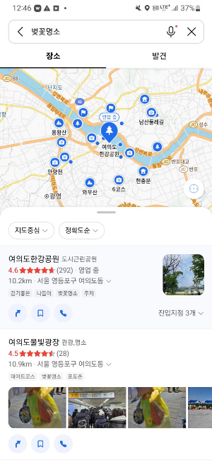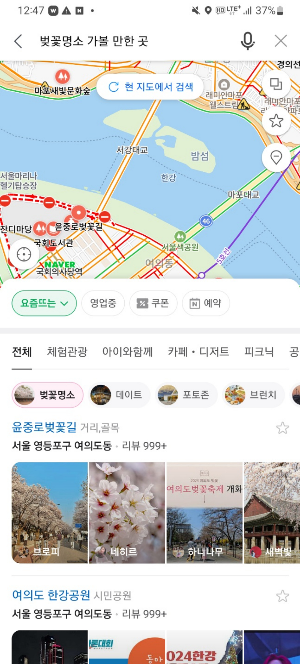 지금은 벚꽃이 한창이라, 네이버 지도와 카카오맵에서는 벚꽃 명소 정보를 한눈에 보여주는 기능이 생겼어요.