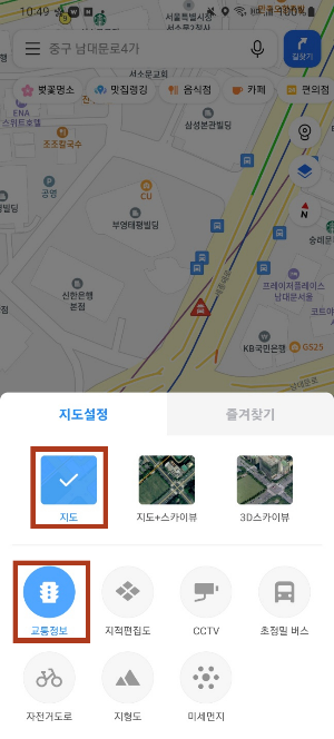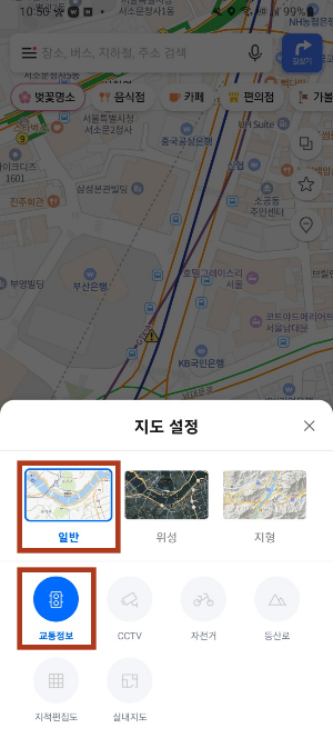 카카오맵 지도설정에서 교통정보 기능 켜기