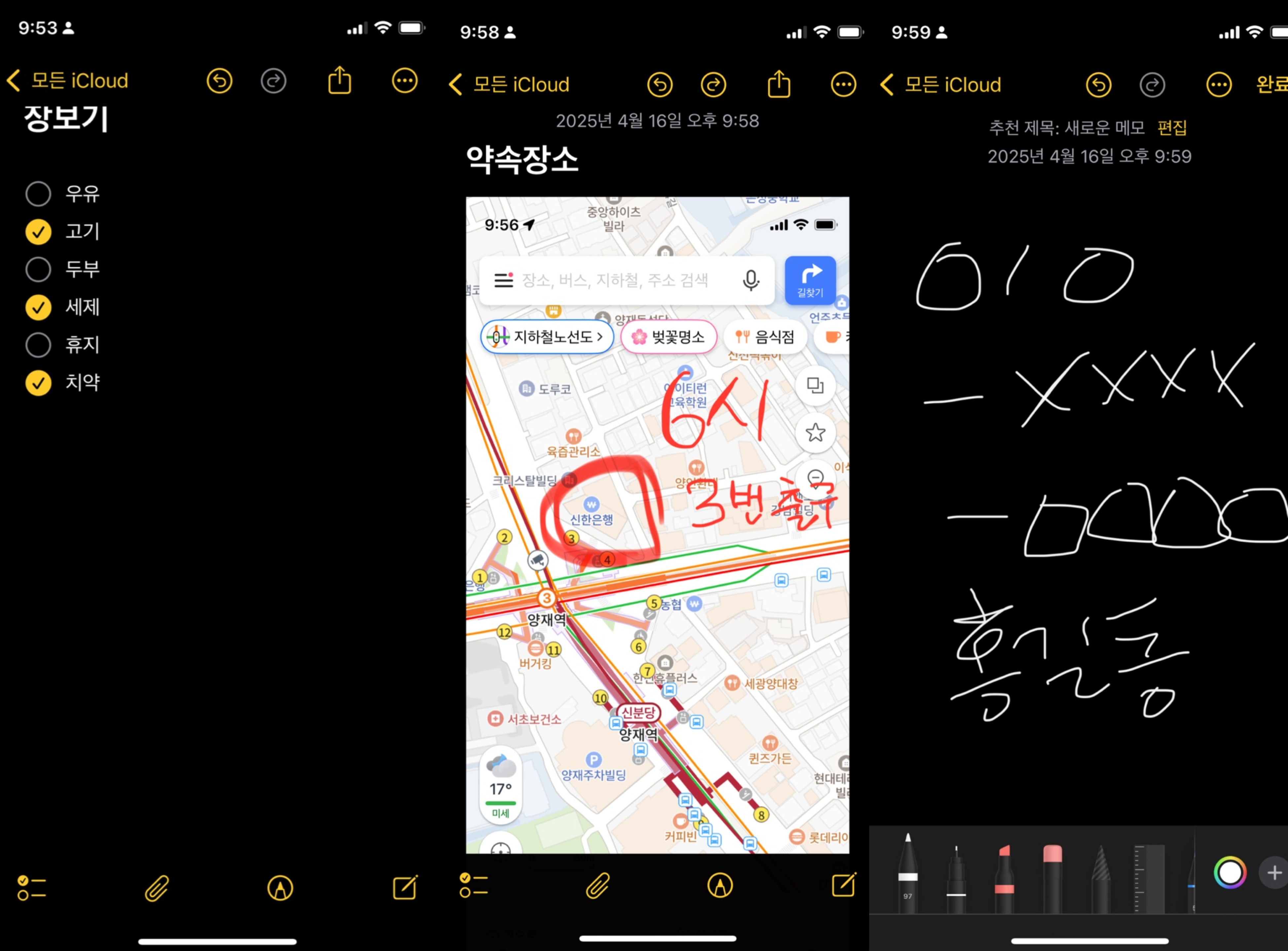예를 들어, 약속 장소의 지도 찍어서 메모에 첨부한 뒤, “6시 1번 출구” 같은 안내를 손글씨로 표시하면 훨씬 기억에 남아요.
